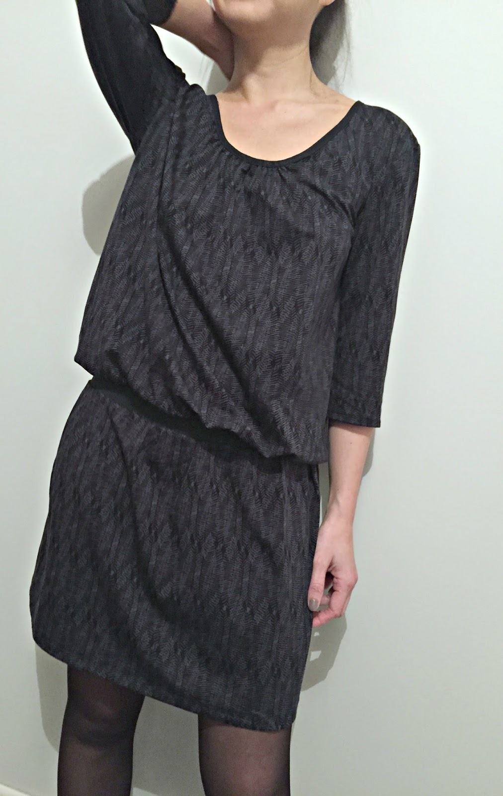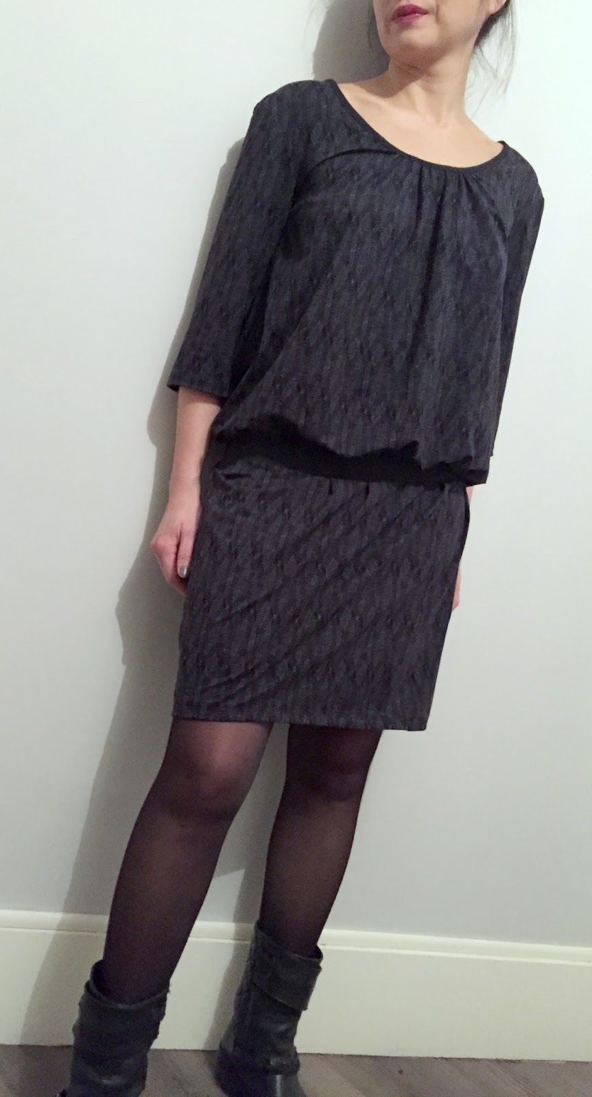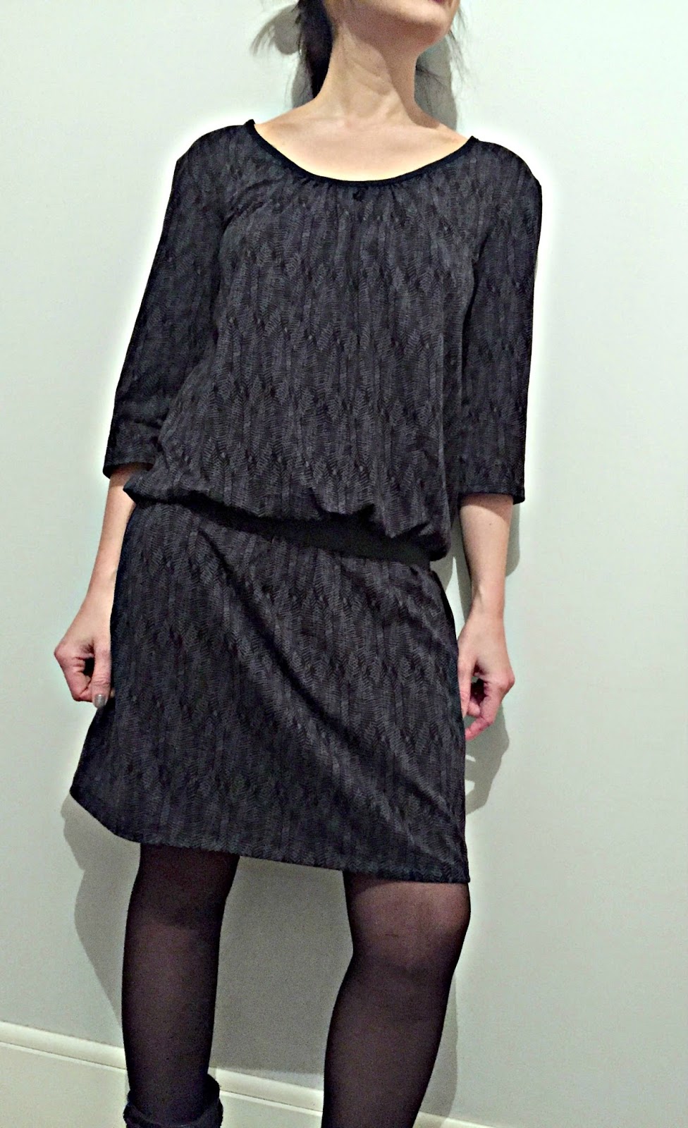For this first version, I chose the printed jersey abstrait by The sweet mercerie for its fluidity and the gathers and ideal with black elastic belt. Also it is very soft so comfortable to wear;))