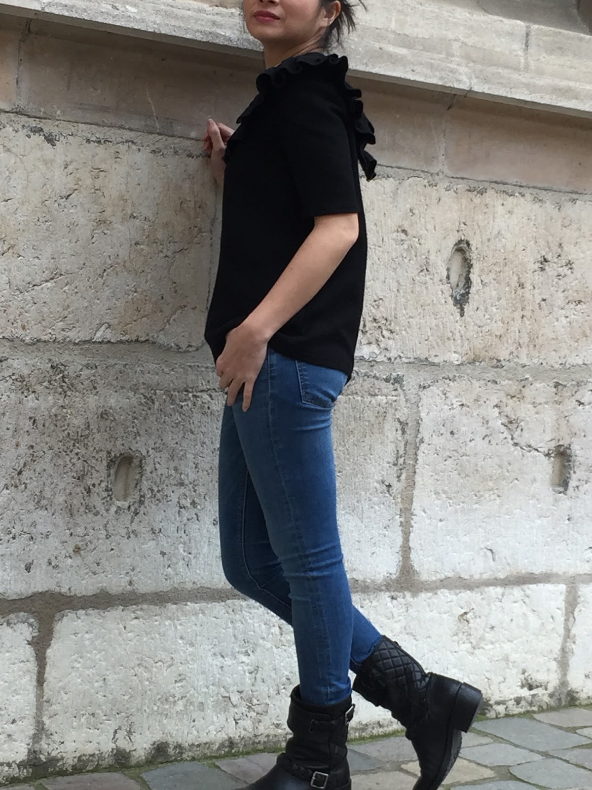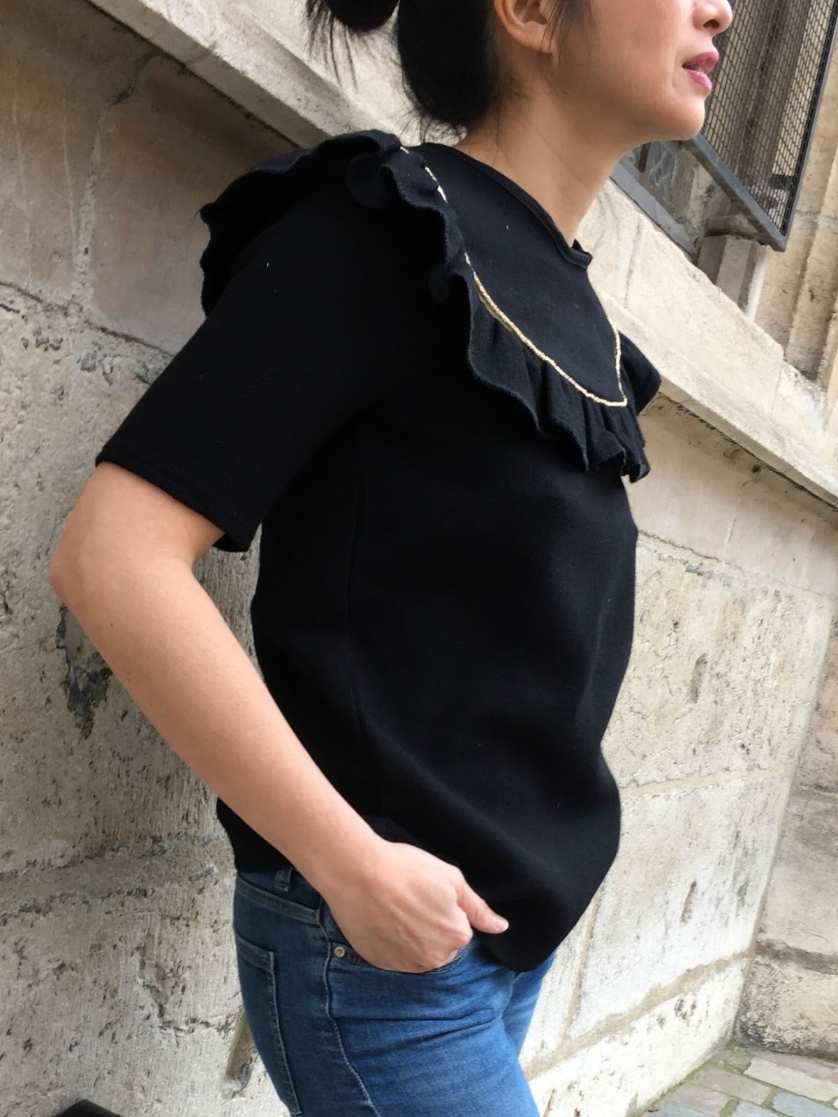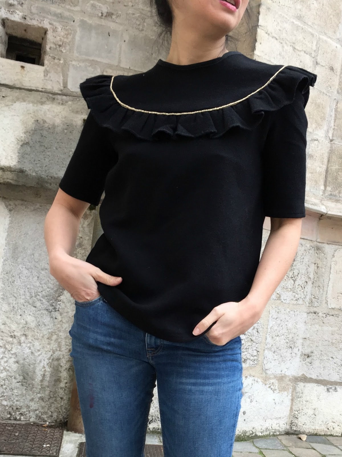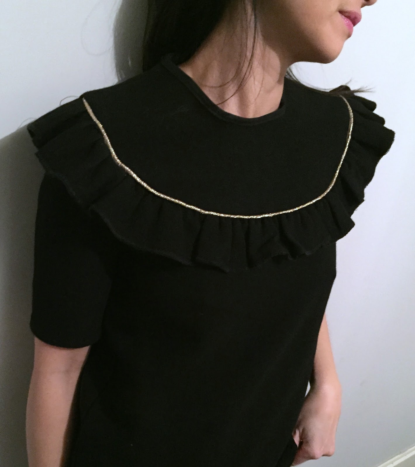 After using the fluidity of viscose, I chose a fabric more consisting so a double black wool crepe by Bennytex (510 gr) to give more volume to gathers … To highlight this detail, I decided ‘adding “gold” piping bought in Fil 2000 (Paris).