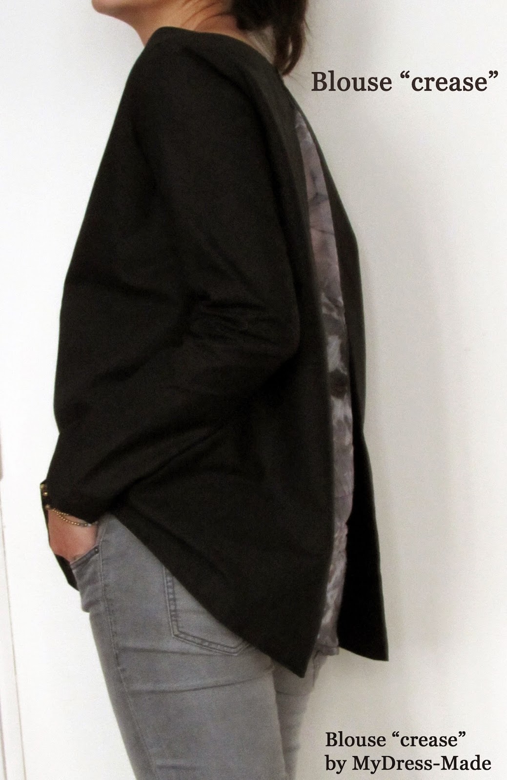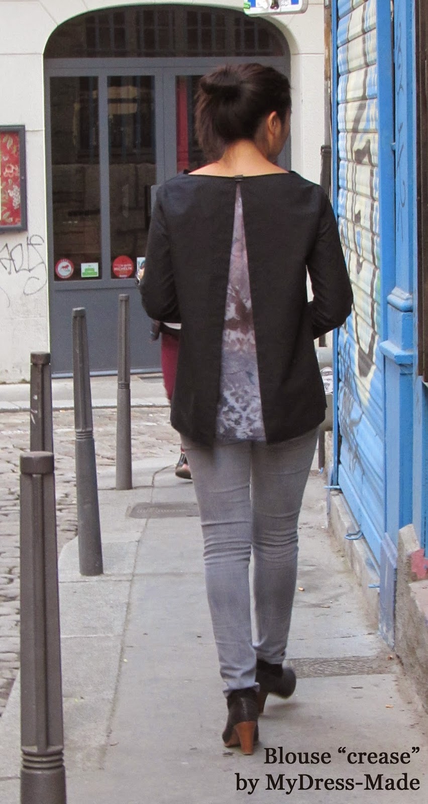 Fabrics: Size S – black cotton poplin 60in x 55in Moline (Paris 18th) – € 10 / 40in – Crease”Tie Dye” coton 20in x 52in – € 7.90 / 40in – The Sweet Mercerie