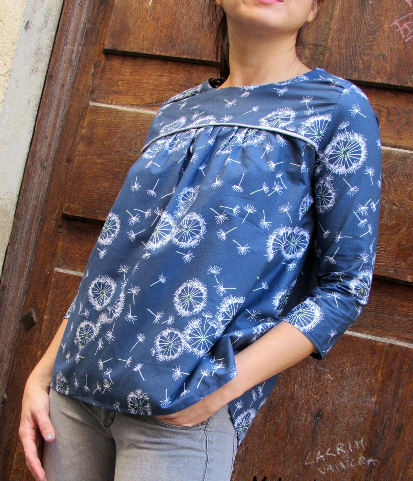Après une série de vestes et manteaux, j’avais envie de simplicité et surtout envie d’une blouse avec ce coton imprimé de toute beauté by Un chat sur un fil. Ce bleu est hypnotique associé à ces pissenlits je craque !!!!