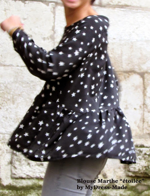 As you could see, many blouses occupy my mind because I sorely lacking in my wardrobe for this autumn / winter. While the MARTHE blouse is just in time because I had jealously kept this beautiful Sonia Rykiel starry silk  acquired a few months ago on Etoffe des héros. Perfect for frown tails !!!!