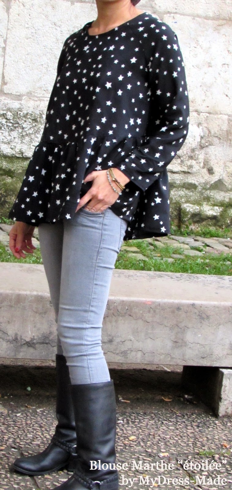 Comme vous avez pu le voir, les blouses occupent beaucoup mon esprit car j’en manque cruellement dans ma garde robe pour cet automne / hiver. Alors la blouse Marthe tombe bien car j’avais jalousement gardé cette magnifique soie étoilée de Sonia Rykiel acquis voilà quelques mois sur Etoffe des Héros. Parfaite pour les basques froncées !!!!