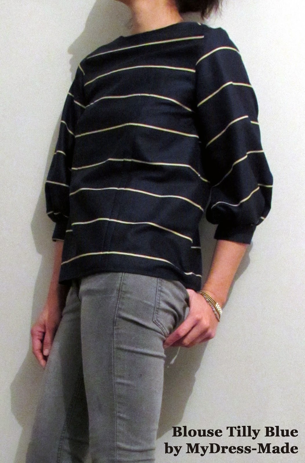 J’ai d’abord imaginé une robe puis après mûre réflexion je me suis dit qu’une blouse s’y prêterait mieux ;))) A mon sens, les rayures horizontales sur une robe sont plus appropriées sur un jersey qu’une viscose.