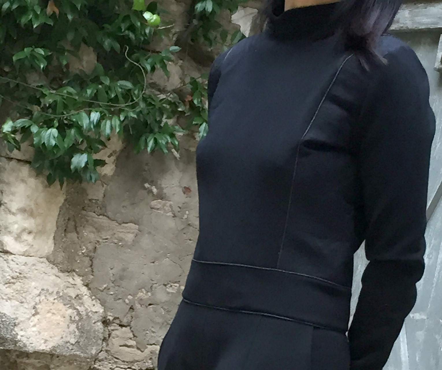 J’ai réalisé le col officier que j’ai “évasé” davantage par rapport au patron initial pour le mettre en exergue. Il ne présente aucune difficulté hormis de la précision au moment des coutures tel un pied de col de chemise. A nouveau, n’hésitez pas à vous aider des repères . Pour un maintien optimal, j’ai posé un crochet au dos du col.