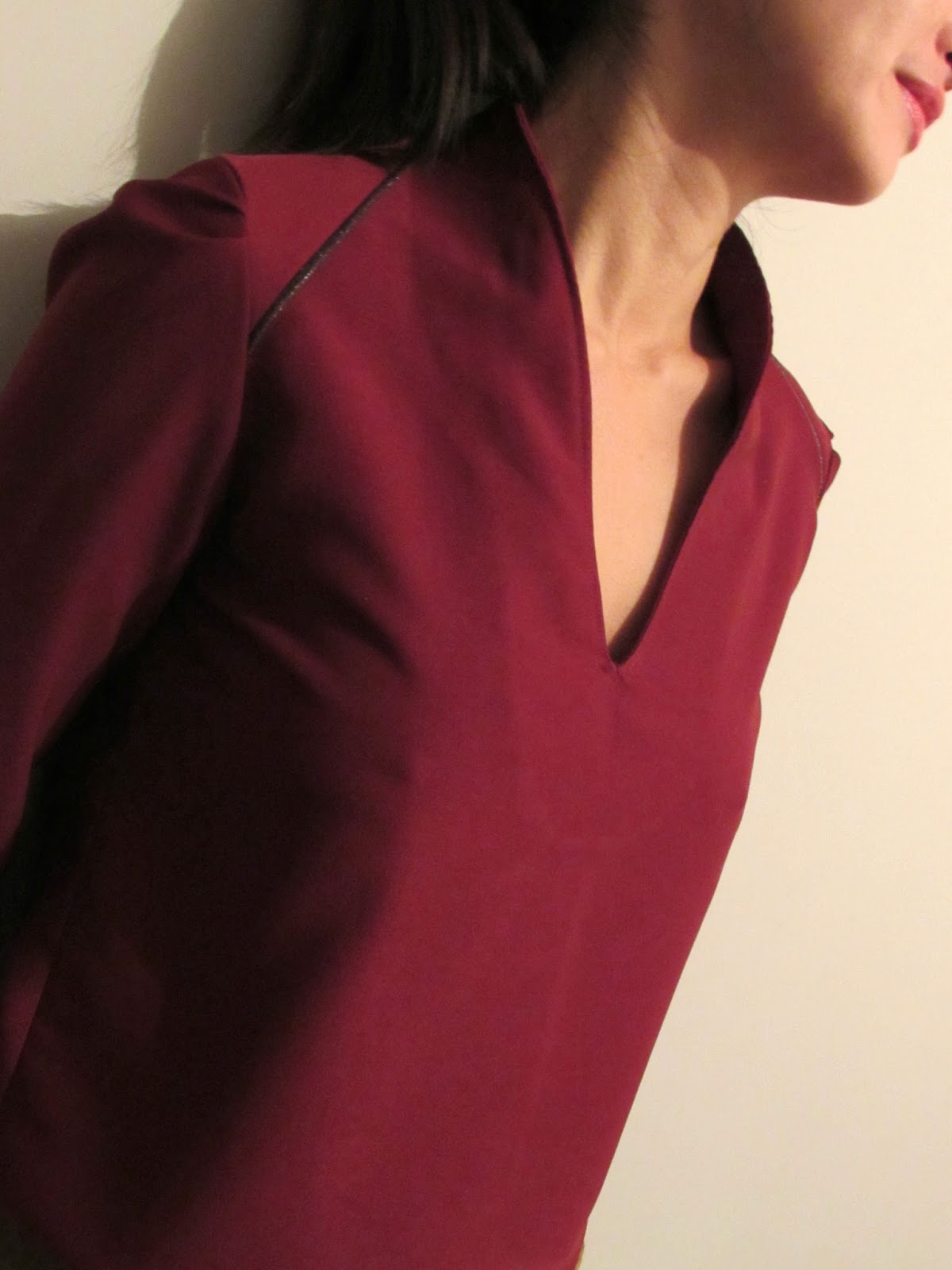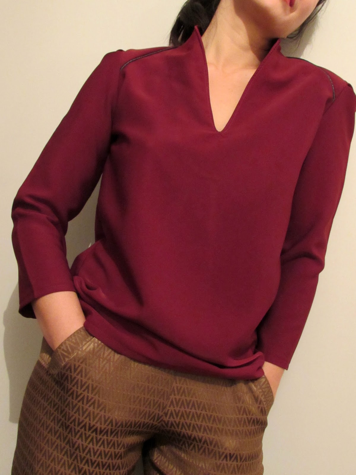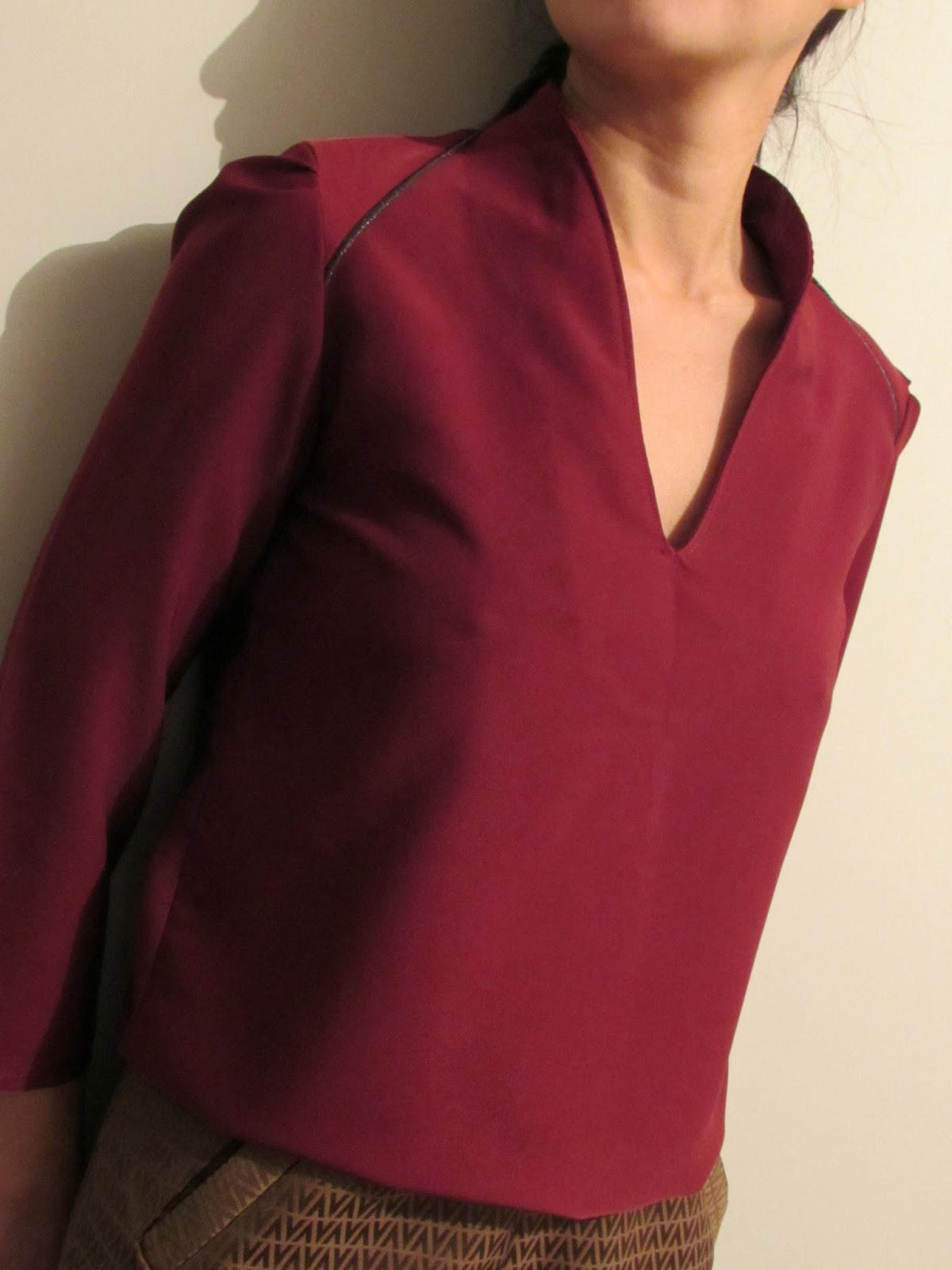 Let the Majestic blouse by Aime comme Marie, I will not revisit the design details and for more information please see my first version. I use a lurex grey piping to highlight the burgundy color.