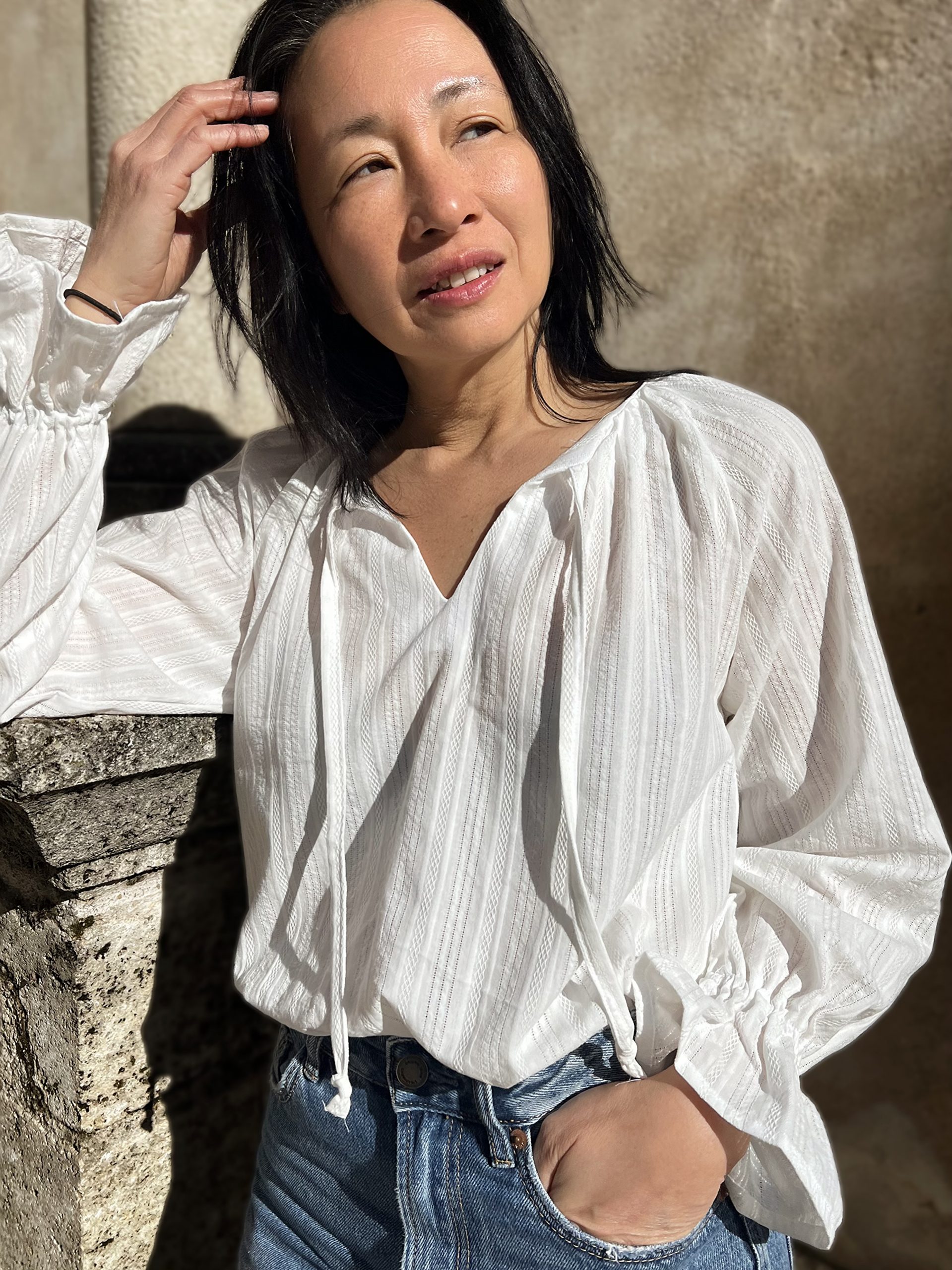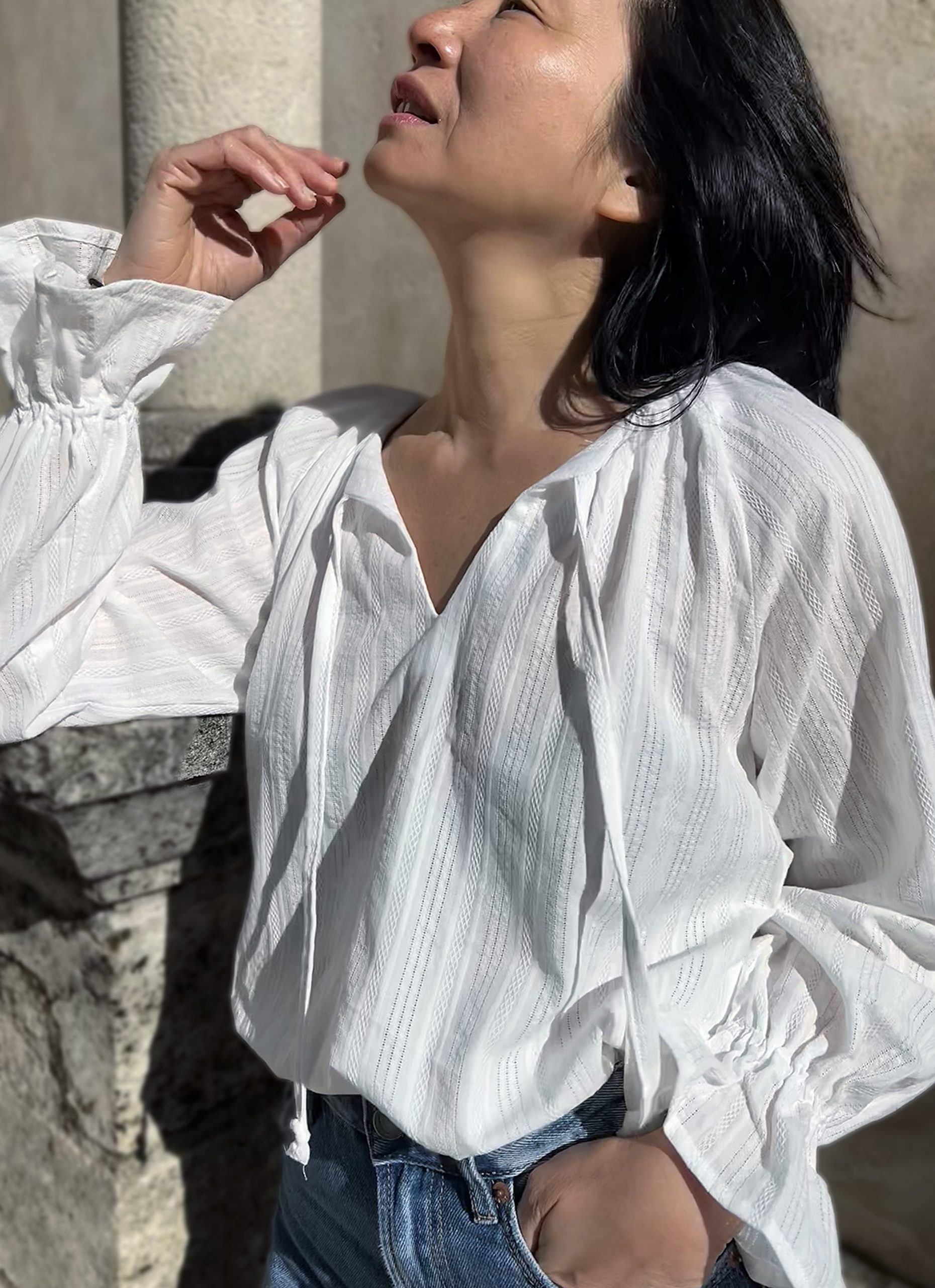 Ici, la blouse Ella se transforme en pièce bohème chic intemporelle, grâce à la broderie Iris à fines rayures. Le tissu apporte du relief et du caractère, tout en restant doux et lumineux. L’encolure avec lien à nouer permet de moduler le style : ouverte pour un look naturel, fermée pour une silhouette plus structurée.