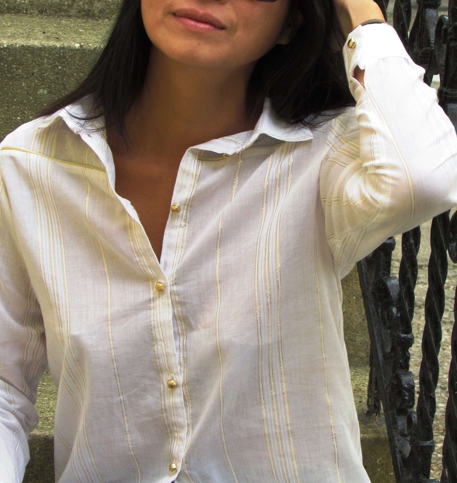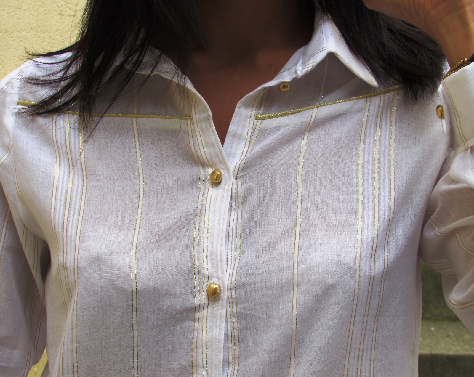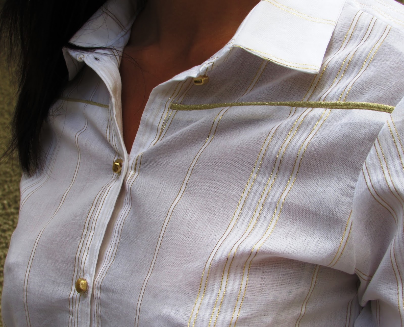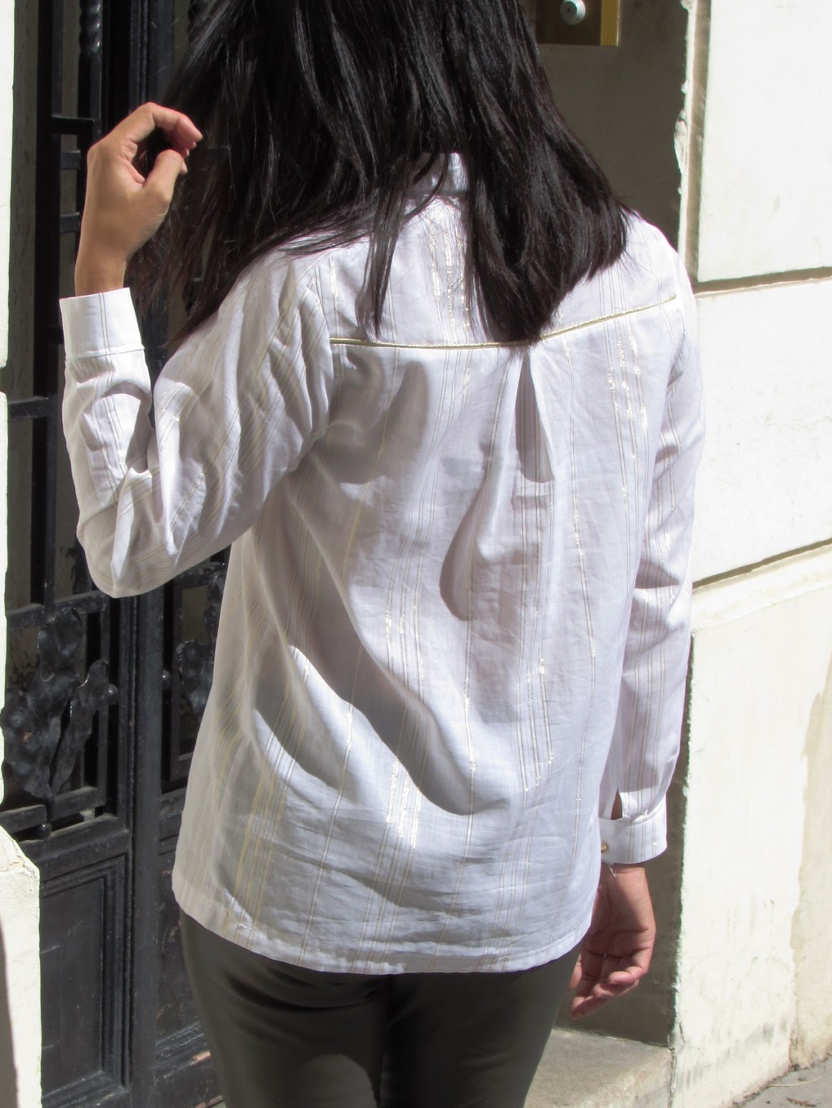 What a pleasure to present you my first shirt !!!! Just a few months you could discover my versions of the Camas blouse Thread & Theory in Lanvin Chiffon and tartan cotton... But I dreamed of making a real shirt collar and lapel … I do not know why it seemed a “mountain” !!! What was the trigger that ? This beautiful cotton with gold fine lines by Pretty Mercerie : a real favorite fabric ;))) It was obvious so I took my time but I was motivated enough to perform. Which pattern for the first shirt? I hesitated and I stood by the Wenona shirt by Named for all the details: the panels, the structure of the sleeves and of course the cut (it has an option not retained pleats here). Anyway I wanted a garment elaborated to mark the occasion !!!