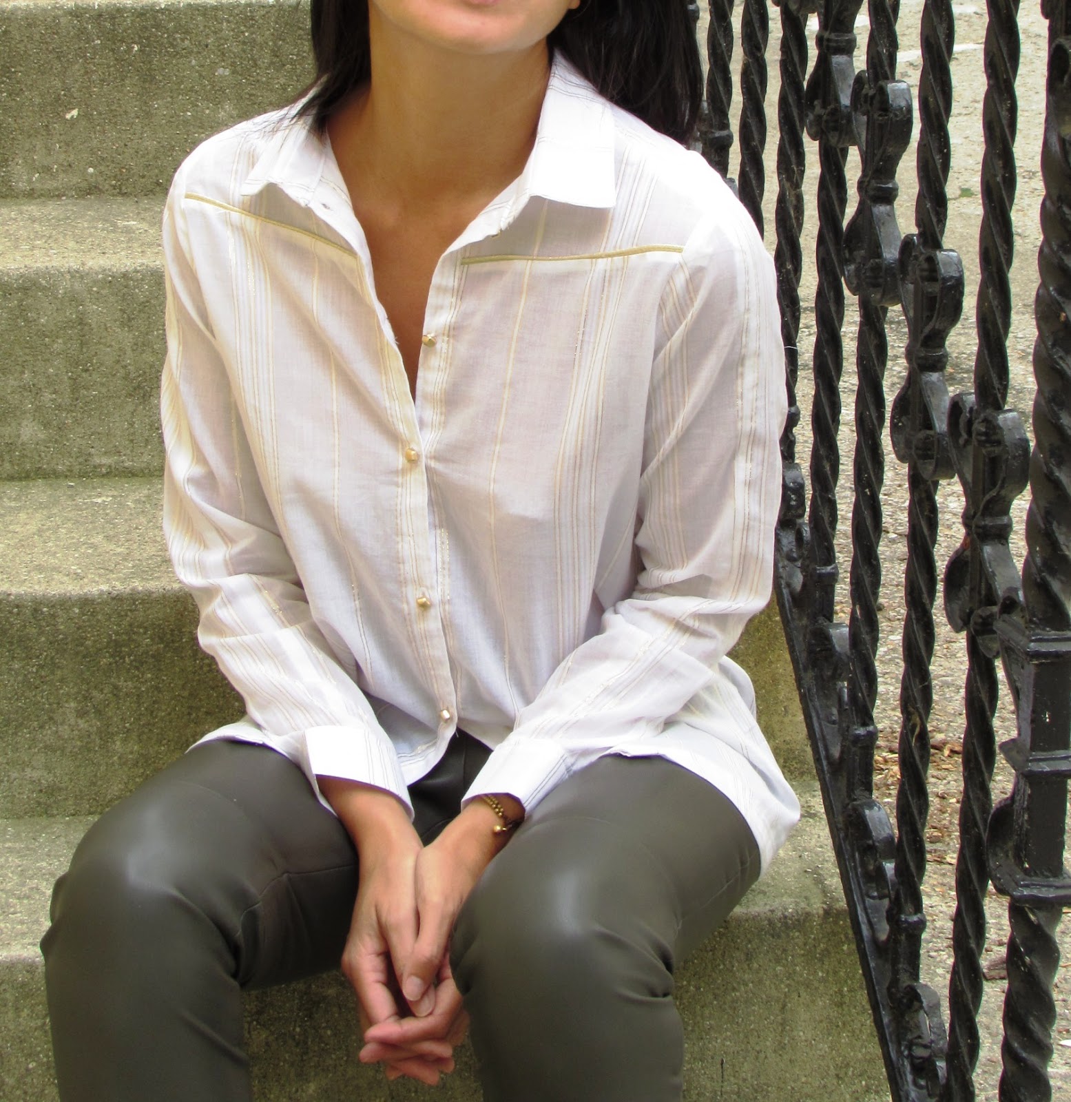 In conclusion, I will not hide my pride for this first real shirt up to my expectations. Here I wore it with a taupe faux leather leggings, but I gladly bear with a pencil skirt or trouser clips …