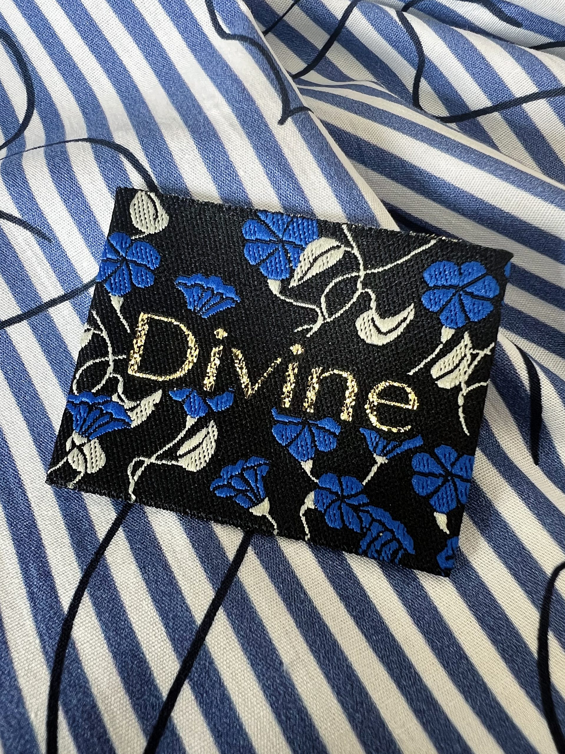 Divine Bleuets est une étiquette à coudre tissée en France au motif floral bleu sur fond noir, idéale pour apporter une finition élégante à vos créations couture. Cette étiquette mesure 4 x 4 cm avec des bords repliés de 6 mm. Elle est pré-pliée sur les deux extrémités pour faciliter la couture, garantir une finition nette et éviter qu’elle ne s’effiloche.