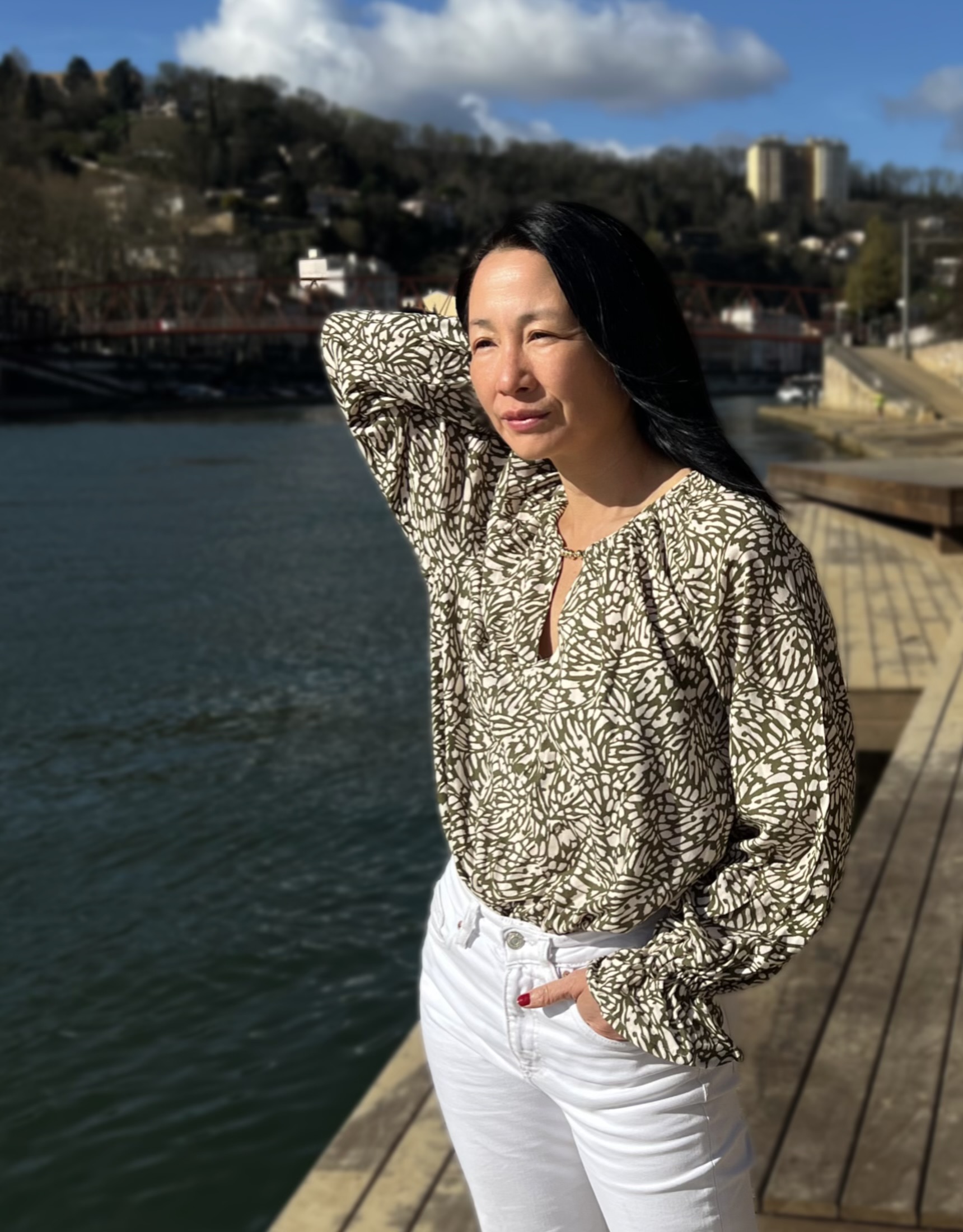 Le crêpe de viscose Butterfly, fluide et léger, sublime les fronces et les volumes de la blouse.