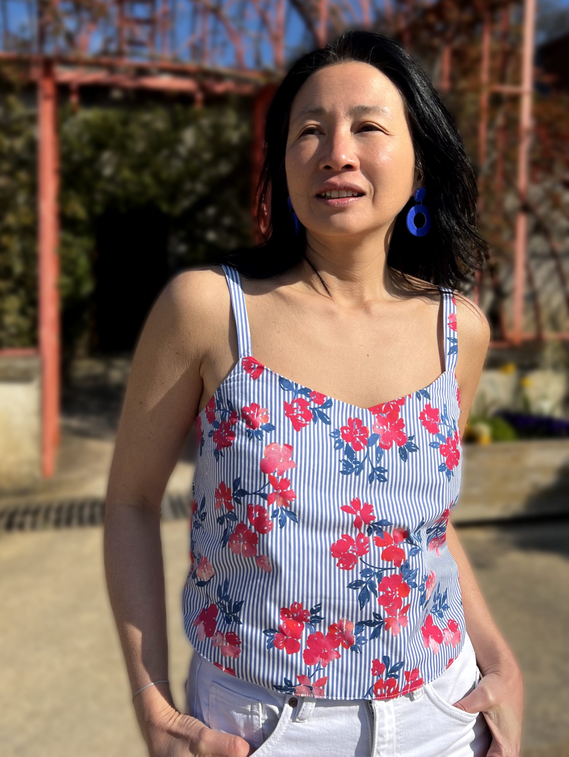 Facile à coudre et agréable à porter, il est idéal pour ce type de top : coton léger et respirant, belle tenue pour structurer la silhouette et imprimé rayures et fleurs lumineuses.
