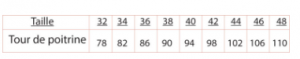 | Tour poitrine | 82 | 86 | 90 | 94 | 98 | 102 |