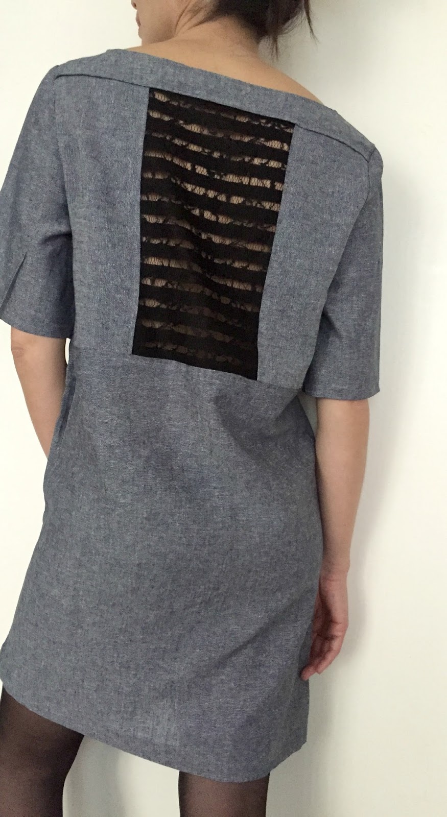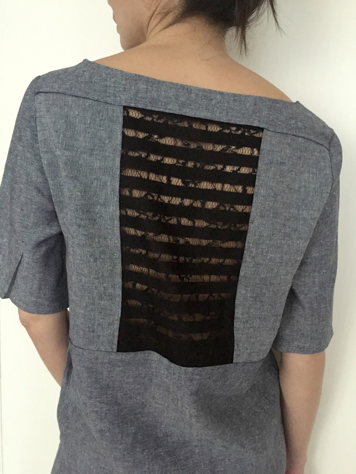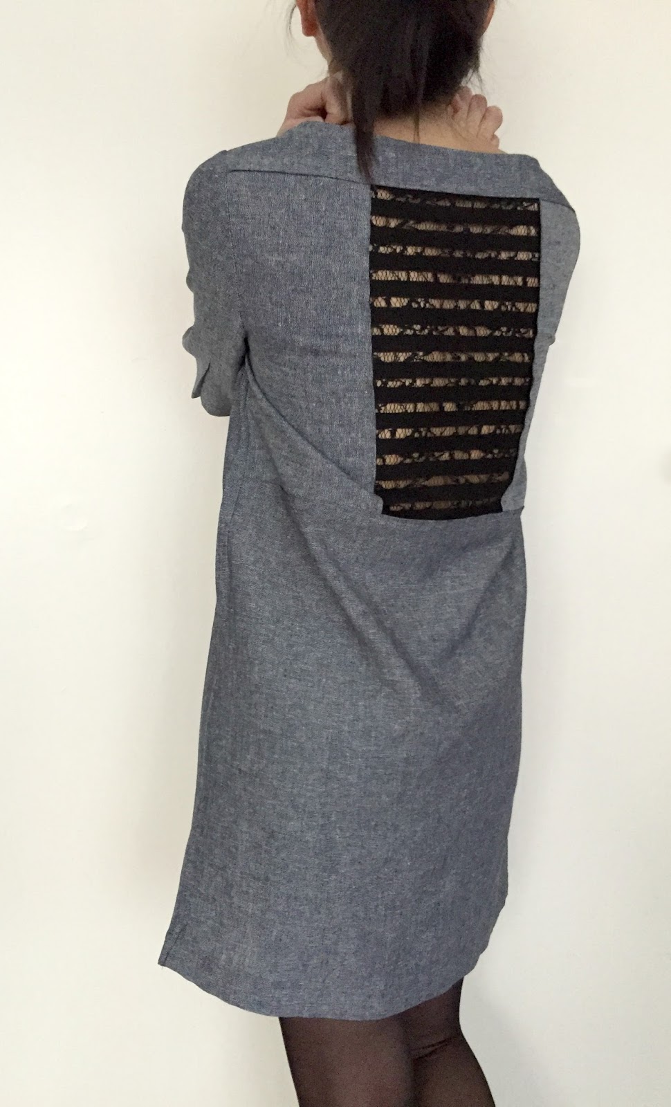 Je dois dire que l’association Lin chambray et dentelle est surprenante et sans difficulté à monter, sachant que l’épaisseur des 2 tissus est équivalente. Ce point est clé pour une harmonie et linéarité optimale du dos ;)) Ainsi si vous souhaitez customiser à souhait selon vos envies cet empiècement dos, il est essentiel d’utiliser un tissu de même consistance.