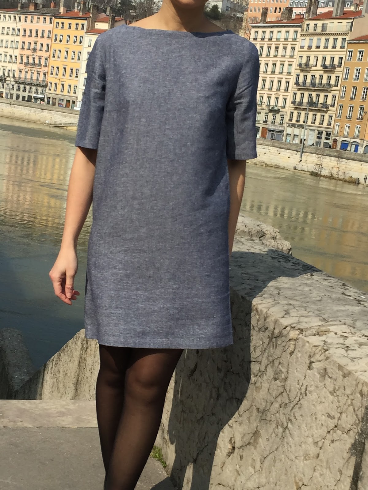 Tissu : T36 – Lin chambray by L’étoffe des héros (1,50 x Laize 1,40m) – 15€/m et dentelle à rayures by Mondial Tissus (50 cm x Laize 1,50 m) – 24,90€/m