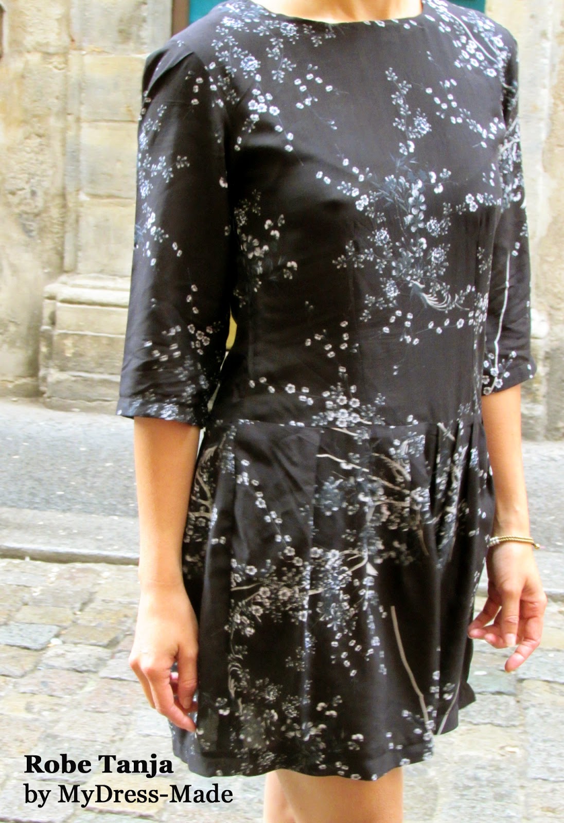 J’imaginais une robe mais laquelle ??? Et après des heures de réflexion, j’ai choisi la robe TANJA de Schnittchen pour sa coupe élégante, cintrée et agrémentée de plis ayant pour vertu de délivrer un effet “vaporeux”. Elle convient à merveille à la fluidité du tissu. Je peux d’ores et déjà vous dire que ce patron fait désormais parti de mes chouchoux ;))))