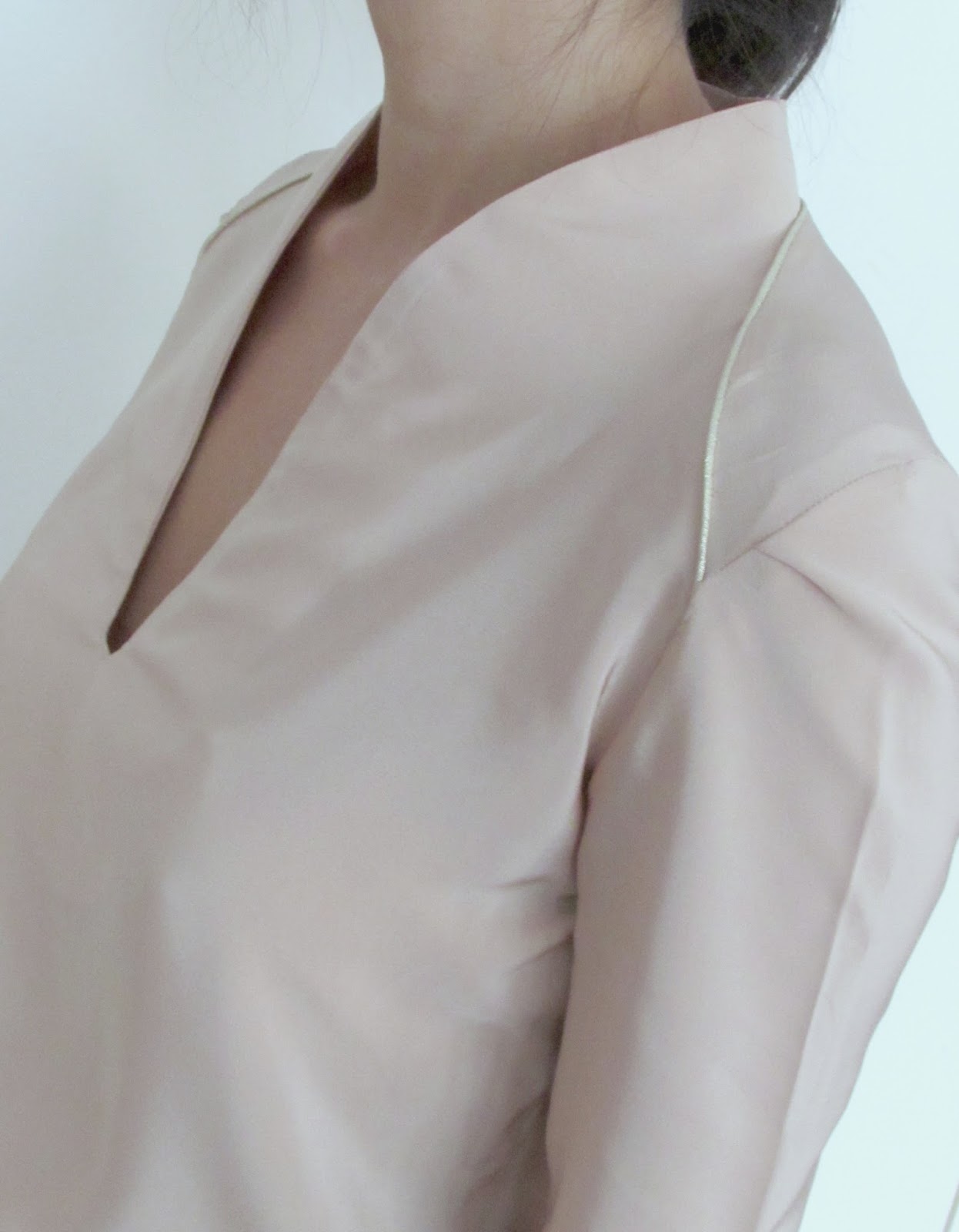 That’s why I wanted to combine the “tulipe” skirt a new version of the Majestic by Aime comme Marie & Cousette, conducted this time in silk. To do so, I took out a “nude” silk by Pretty Mercerie jealously guarded for the model “so chic”. It’s been ages since I expected to find this pink powder and Pretty Mercerie made this “dream” possible, I am totally “fan” of the color synonymous “class”. To raise the collar, I chose gold piping that combines perfectly with the “nude”!