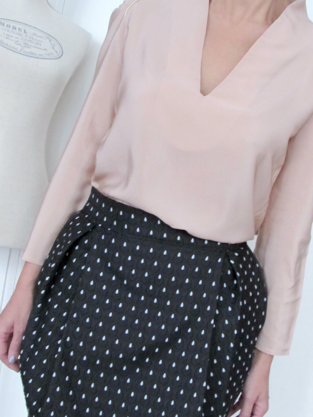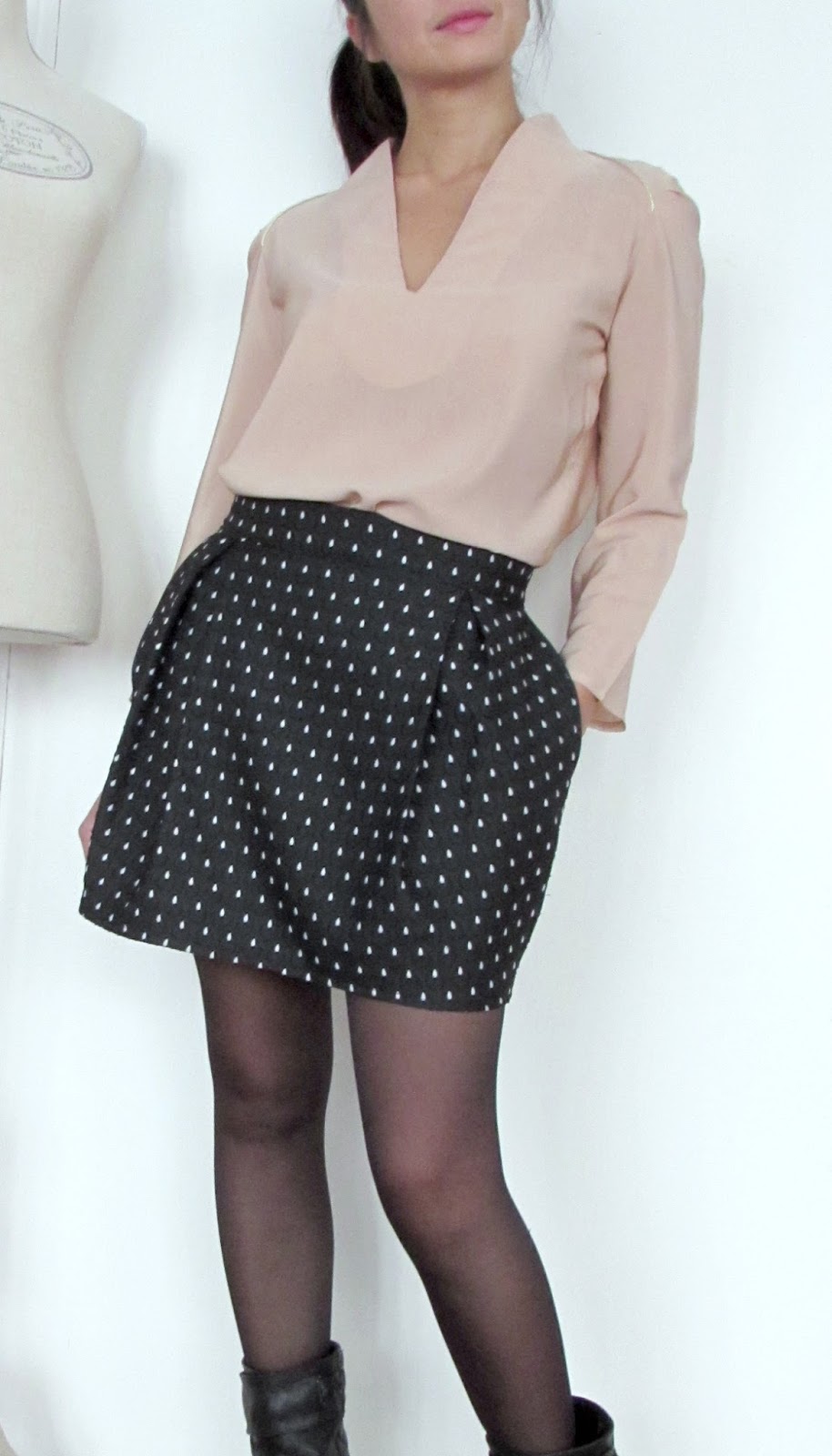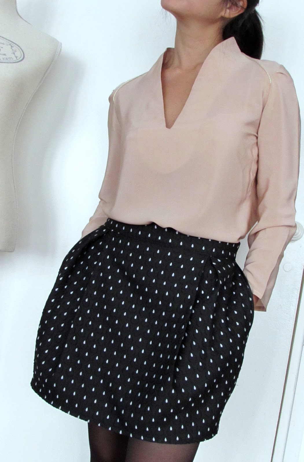 Tissus : T 36 – Soie “nude”by Pretty Mercerie – (1,50m x Laize 1,35m, 75 gr) – 29,70€ /m et Jacquard “gouttes” (1m x Laize 1,50m, 300 gr)