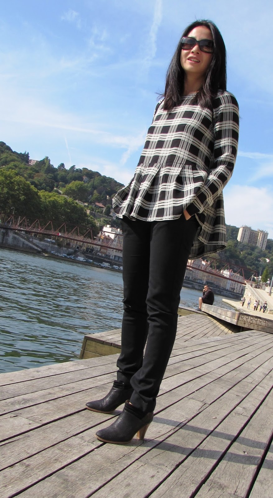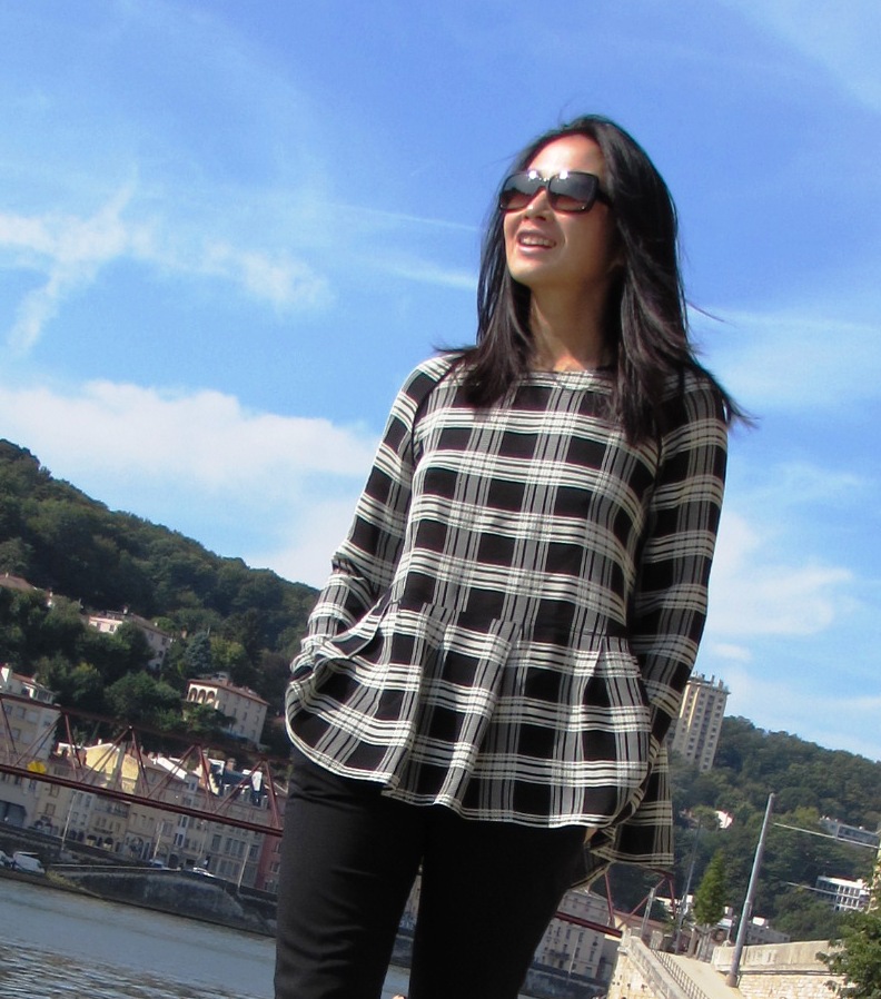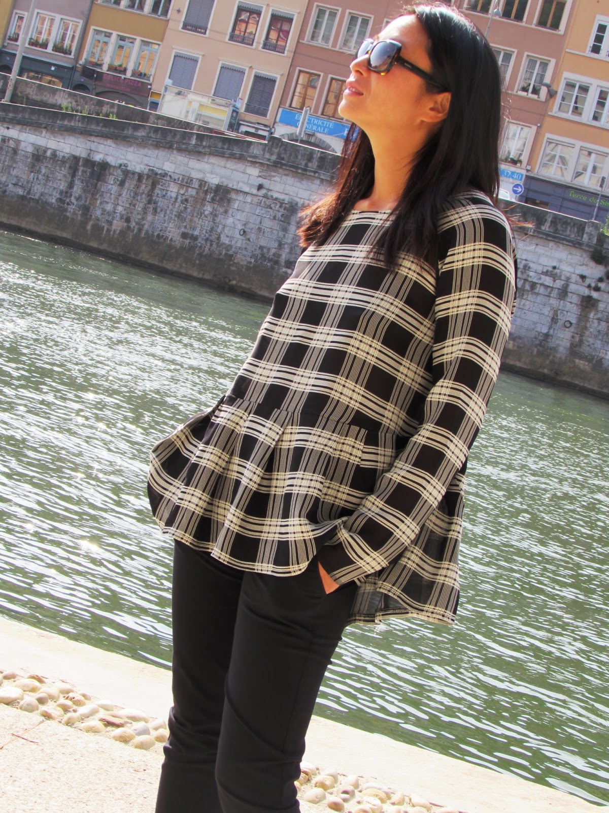 So when I saw this fabric with white & black marshmallow tiles by Pretty Mercerie & marshmallow I liked its pattern, key this year ;)) Once in hands it is very smooth and slightly transparent (but still acceptable thanks to the tiles) I imagined a “vaporous” blouse … Spontaneously I imagined the Marthe blouse by Republique du Chiffon, the safe value that will offer full scope to the fluidity through its “basques”;)))) By the way, I liked to wear my first version in starry silk by Sonia Rickiel to review;)))
